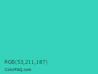 RGB 53,211,187 Color is a normal cyan color and the nearest color is Turquoise PWG #30d5c8. Hex code #35d3bb and RGB value is rgb(53,211,187). In RGB color space, this color is composed of 21% red, 83% green, 73% blue, In CMYK color space, this color is composed of 75% cyan, 0% magenta, 11% yellow , 17% black , In HSL color space, this color has a hue angle of 171° , 64% saturation and 52% lightness.