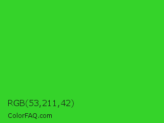 RGB 53,211,42 Color is a normal green color and the nearest color is Lime Green #32cd32. Hex code #35d32a and RGB value is rgb(53,211,42). In RGB color space, this color is composed of 21% red, 83% green, 16% blue, In CMYK color space, this color is composed of 75% cyan, 0% magenta, 80% yellow , 17% black , In HSL color space, this color has a hue angle of 116° , 67% saturation and 50% lightness.