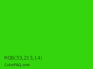 RGB 53,213,14 Color is a normal green color and the nearest color is Harlequin Green #46cb18. Hex code #35d50e and RGB value is rgb(53,213,14). In RGB color space, this color is composed of 21% red, 84% green, 5% blue, In CMYK color space, this color is composed of 75% cyan, 0% magenta, 93% yellow , 16% black , In HSL color space, this color has a hue angle of 108° , 88% saturation and 45% lightness.