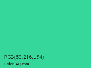 RGB 53,216,154 Color is a normal green color and the nearest color is Shamrock #33cc99. Hex code #35d89a and RGB value is rgb(53,216,154). In RGB color space, this color is composed of 21% red, 85% green, 60% blue, In CMYK color space, this color is composed of 75% cyan, 0% magenta, 29% yellow , 15% black , In HSL color space, this color has a hue angle of 157° , 68% saturation and 53% lightness.