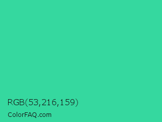 RGB 53,216,159 Color is a normal green color and the nearest color is Shamrock #33cc99. Hex code #35d89f and RGB value is rgb(53,216,159). In RGB color space, this color is composed of 21% red, 85% green, 62% blue, In CMYK color space, this color is composed of 75% cyan, 0% magenta, 26% yellow , 15% black , In HSL color space, this color has a hue angle of 159° , 68% saturation and 53% lightness.