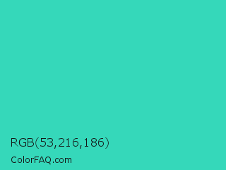 RGB 53,216,186 Color is a normal cyan color and the nearest color is Turquoise PWG #30d5c8. Hex code #35d8ba and RGB value is rgb(53,216,186). In RGB color space, this color is composed of 21% red, 85% green, 73% blue, In CMYK color space, this color is composed of 75% cyan, 0% magenta, 14% yellow , 15% black , In HSL color space, this color has a hue angle of 169° , 68% saturation and 53% lightness.