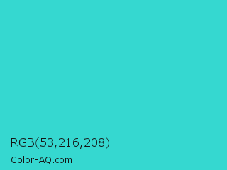 RGB 53,216,208 Color is a normal cyan color and the nearest color is Turquoise PWG #30d5c8. Hex code #35d8d0 and RGB value is rgb(53,216,208). In RGB color space, this color is composed of 21% red, 85% green, 82% blue, In CMYK color space, this color is composed of 75% cyan, 0% magenta, 4% yellow , 15% black , In HSL color space, this color has a hue angle of 177° , 68% saturation and 53% lightness.