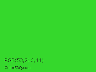RGB 53,216,44 Color is a normal green color and the nearest color is Lime Green #32cd32. Hex code #35d82c and RGB value is rgb(53,216,44). In RGB color space, this color is composed of 21% red, 85% green, 17% blue, In CMYK color space, this color is composed of 75% cyan, 0% magenta, 80% yellow , 15% black , In HSL color space, this color has a hue angle of 117° , 69% saturation and 51% lightness.