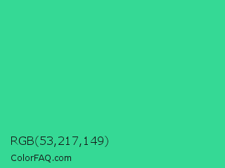 RGB 53,217,149 Color is a normal green color and the nearest color is Shamrock #33cc99. Hex code #35d995 and RGB value is rgb(53,217,149). In RGB color space, this color is composed of 21% red, 85% green, 58% blue, In CMYK color space, this color is composed of 76% cyan, 0% magenta, 31% yellow , 15% black , In HSL color space, this color has a hue angle of 155° , 68% saturation and 53% lightness.