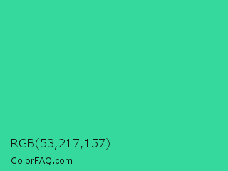 RGB 53,217,157 Color is a normal green color and the nearest color is Shamrock #33cc99. Hex code #35d99d and RGB value is rgb(53,217,157). In RGB color space, this color is composed of 21% red, 85% green, 62% blue, In CMYK color space, this color is composed of 76% cyan, 0% magenta, 28% yellow , 15% black , In HSL color space, this color has a hue angle of 158° , 68% saturation and 53% lightness.