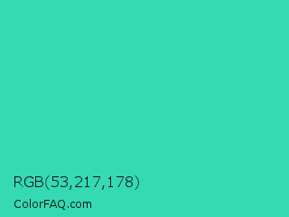 RGB 53,217,178 Color is a normal cyan color and the nearest color is Eucalyptus #44d7a8. Hex code #35d9b2 and RGB value is rgb(53,217,178). In RGB color space, this color is composed of 21% red, 85% green, 70% blue, In CMYK color space, this color is composed of 76% cyan, 0% magenta, 18% yellow , 15% black , In HSL color space, this color has a hue angle of 166° , 68% saturation and 53% lightness.