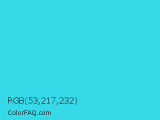 RGB 53,217,232 Color is a normal cyan color and the nearest color is Turquoise #40e0d0. Hex code #35d9e8 and RGB value is rgb(53,217,232). In RGB color space, this color is composed of 21% red, 85% green, 91% blue, In CMYK color space, this color is composed of 77% cyan, 6% magenta, 0% yellow , 9% black , In HSL color space, this color has a hue angle of 185° , 80% saturation and 56% lightness.