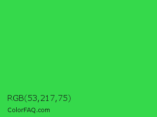 RGB 53,217,75 Color is a normal green color and the nearest color is Lime Green #32cd32. Hex code #35d94b and RGB value is rgb(53,217,75). In RGB color space, this color is composed of 21% red, 85% green, 29% blue, In CMYK color space, this color is composed of 76% cyan, 0% magenta, 65% yellow , 15% black , In HSL color space, this color has a hue angle of 128° , 68% saturation and 53% lightness.