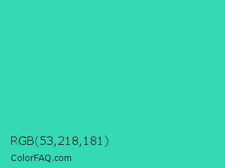 RGB 53,218,181 Color is a normal cyan color and the nearest color is Eucalyptus #44d7a8. Hex code #35dab5 and RGB value is rgb(53,218,181). In RGB color space, this color is composed of 21% red, 85% green, 71% blue, In CMYK color space, this color is composed of 76% cyan, 0% magenta, 17% yellow , 15% black , In HSL color space, this color has a hue angle of 167° , 69% saturation and 53% lightness.