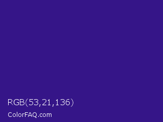 RGB 53,21,136 Color is a normal indigo color and the nearest color is Pixie Powder #391285. Hex code #351588 and RGB value is rgb(53,21,136). In RGB color space, this color is composed of 21% red, 8% green, 53% blue, In CMYK color space, this color is composed of 61% cyan, 85% magenta, 0% yellow , 47% black , In HSL color space, this color has a hue angle of 257° , 73% saturation and 31% lightness.