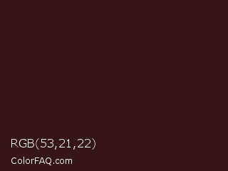 RGB 53,21,22 Color is a very dark red color and the nearest color is Tamarind #341515. Hex code #351516 and RGB value is rgb(53,21,22). In RGB color space, this color is composed of 21% red, 8% green, 9% blue, In CMYK color space, this color is composed of 0% cyan, 60% magenta, 58% yellow , 79% black , In HSL color space, this color has a hue angle of 358° , 43% saturation and 15% lightness.