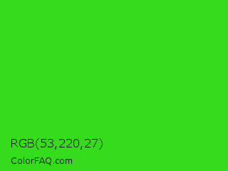 RGB 53,220,27 Color is a normal green color and the nearest color is Harlequin Green #46cb18. Hex code #35dc1b and RGB value is rgb(53,220,27). In RGB color space, this color is composed of 21% red, 86% green, 11% blue, In CMYK color space, this color is composed of 76% cyan, 0% magenta, 88% yellow , 14% black , In HSL color space, this color has a hue angle of 112° , 78% saturation and 48% lightness.