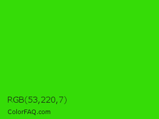 RGB 53,220,7 Color is a normal green color and the nearest color is Harlequin Green #46cb18. Hex code #35dc07 and RGB value is rgb(53,220,7). In RGB color space, this color is composed of 21% red, 86% green, 3% blue, In CMYK color space, this color is composed of 76% cyan, 0% magenta, 97% yellow , 14% black , In HSL color space, this color has a hue angle of 107° , 94% saturation and 45% lightness.