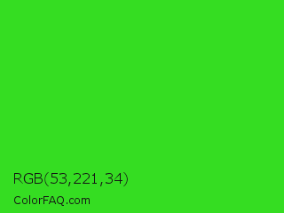 RGB 53,221,34 Color is a normal green color and the nearest color is Lime Green #32cd32. Hex code #35dd22 and RGB value is rgb(53,221,34). In RGB color space, this color is composed of 21% red, 87% green, 13% blue, In CMYK color space, this color is composed of 76% cyan, 0% magenta, 85% yellow , 13% black , In HSL color space, this color has a hue angle of 114° , 73% saturation and 50% lightness.