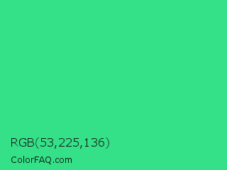 RGB 53,225,136 Color is a normal green color and the nearest color is Shamrock #33cc99. Hex code #35e188 and RGB value is rgb(53,225,136). In RGB color space, this color is composed of 21% red, 88% green, 53% blue, In CMYK color space, this color is composed of 76% cyan, 0% magenta, 40% yellow , 12% black , In HSL color space, this color has a hue angle of 149° , 74% saturation and 55% lightness.