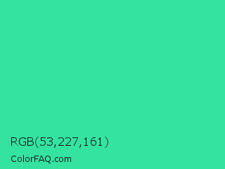 RGB 53,227,161 Color is a normal green color and the nearest color is Eucalyptus #44d7a8. Hex code #35e3a1 and RGB value is rgb(53,227,161). In RGB color space, this color is composed of 21% red, 89% green, 63% blue, In CMYK color space, this color is composed of 77% cyan, 0% magenta, 29% yellow , 11% black , In HSL color space, this color has a hue angle of 157° , 76% saturation and 55% lightness.