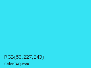 RGB 53,227,243 Color is a normal cyan color and the nearest color is Loeen #15f2fd. Hex code #35e3f3 and RGB value is rgb(53,227,243). In RGB color space, this color is composed of 21% red, 89% green, 95% blue, In CMYK color space, this color is composed of 78% cyan, 7% magenta, 0% yellow , 5% black , In HSL color space, this color has a hue angle of 185° , 89% saturation and 58% lightness.