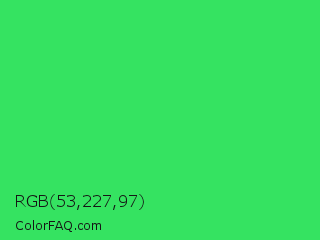 RGB 53,227,97 Color is a normal green color and the nearest color is UFO Green #3cd070. Hex code #35e361 and RGB value is rgb(53,227,97). In RGB color space, this color is composed of 21% red, 89% green, 38% blue, In CMYK color space, this color is composed of 77% cyan, 0% magenta, 57% yellow , 11% black , In HSL color space, this color has a hue angle of 135° , 76% saturation and 55% lightness.