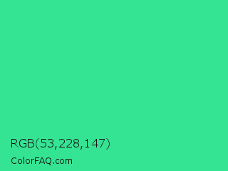 RGB 53,228,147 Color is a normal green color and the nearest color is Shamrock #33cc99. Hex code #35e493 and RGB value is rgb(53,228,147). In RGB color space, this color is composed of 21% red, 89% green, 58% blue, In CMYK color space, this color is composed of 77% cyan, 0% magenta, 36% yellow , 11% black , In HSL color space, this color has a hue angle of 152° , 76% saturation and 55% lightness.