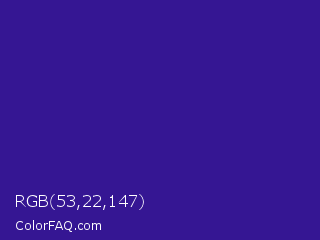 RGB 53,22,147 Color is a normal indigo color and the nearest color is Blue Gem #2c0e8c. Hex code #351693 and RGB value is rgb(53,22,147). In RGB color space, this color is composed of 21% red, 9% green, 58% blue, In CMYK color space, this color is composed of 64% cyan, 85% magenta, 0% yellow , 42% black , In HSL color space, this color has a hue angle of 255° , 74% saturation and 33% lightness.