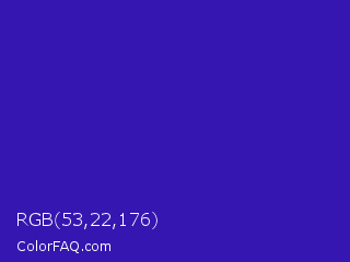 RGB 53,22,176 Color is a normal indigo color and the nearest color is Interdimensional Blue #360ccc. Hex code #3516b0 and RGB value is rgb(53,22,176). In RGB color space, this color is composed of 21% red, 9% green, 69% blue, In CMYK color space, this color is composed of 70% cyan, 88% magenta, 0% yellow , 31% black , In HSL color space, this color has a hue angle of 252° , 78% saturation and 39% lightness.