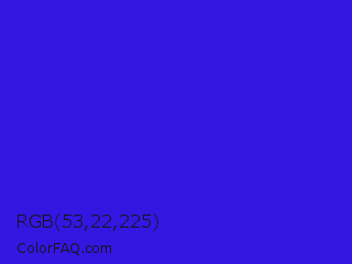 RGB 53,22,225 Color is a normal indigo color and the nearest color is Interdimensional Blue #360ccc. Hex code #3516e1 and RGB value is rgb(53,22,225). In RGB color space, this color is composed of 21% red, 9% green, 88% blue, In CMYK color space, this color is composed of 76% cyan, 90% magenta, 0% yellow , 12% black , In HSL color space, this color has a hue angle of 249° , 82% saturation and 48% lightness.