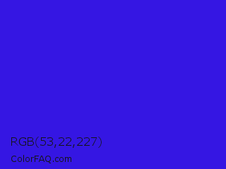 RGB 53,22,227 Color is a normal indigo color and the nearest color is Interdimensional Blue #360ccc. Hex code #3516e3 and RGB value is rgb(53,22,227). In RGB color space, this color is composed of 21% red, 9% green, 89% blue, In CMYK color space, this color is composed of 77% cyan, 90% magenta, 0% yellow , 11% black , In HSL color space, this color has a hue angle of 249° , 82% saturation and 49% lightness.