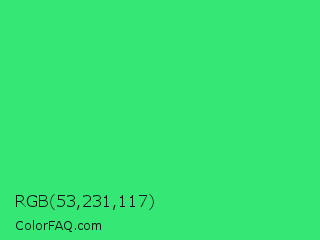 RGB 53,231,117 Color is a normal green color and the nearest color is UFO Green #3cd070. Hex code #35e775 and RGB value is rgb(53,231,117). In RGB color space, this color is composed of 21% red, 91% green, 46% blue, In CMYK color space, this color is composed of 77% cyan, 0% magenta, 49% yellow , 9% black , In HSL color space, this color has a hue angle of 142° , 79% saturation and 56% lightness.