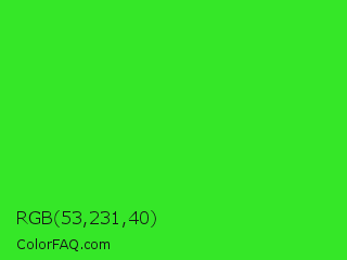 RGB 53,231,40 Color is a normal green color and the nearest color is Lime Green #32cd32. Hex code #35e728 and RGB value is rgb(53,231,40). In RGB color space, this color is composed of 21% red, 91% green, 16% blue, In CMYK color space, this color is composed of 77% cyan, 0% magenta, 83% yellow , 9% black , In HSL color space, this color has a hue angle of 116° , 80% saturation and 53% lightness.
