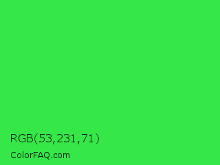 RGB 53,231,71 Color is a normal green color and the nearest color is Lime Green #32cd32. Hex code #35e747 and RGB value is rgb(53,231,71). In RGB color space, this color is composed of 21% red, 91% green, 28% blue, In CMYK color space, this color is composed of 77% cyan, 0% magenta, 69% yellow , 9% black , In HSL color space, this color has a hue angle of 126° , 79% saturation and 56% lightness.