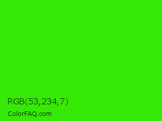 RGB 53,234,7 Color is a normal green color and the nearest color is Harlequin #3fff00. Hex code #35ea07 and RGB value is rgb(53,234,7). In RGB color space, this color is composed of 21% red, 92% green, 3% blue, In CMYK color space, this color is composed of 77% cyan, 0% magenta, 97% yellow , 8% black , In HSL color space, this color has a hue angle of 108° , 94% saturation and 47% lightness.
