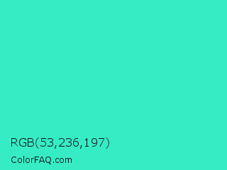 RGB 53,236,197 Color is a normal cyan color and the nearest color is Turquoise #40e0d0. Hex code #35ecc5 and RGB value is rgb(53,236,197). In RGB color space, this color is composed of 21% red, 93% green, 77% blue, In CMYK color space, this color is composed of 78% cyan, 0% magenta, 17% yellow , 7% black , In HSL color space, this color has a hue angle of 167° , 83% saturation and 57% lightness.