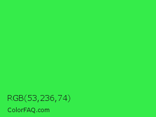 RGB 53,236,74 Color is a normal green color and the nearest color is Lime Green #32cd32. Hex code #35ec4a and RGB value is rgb(53,236,74). In RGB color space, this color is composed of 21% red, 93% green, 29% blue, In CMYK color space, this color is composed of 78% cyan, 0% magenta, 69% yellow , 7% black , In HSL color space, this color has a hue angle of 127° , 83% saturation and 57% lightness.