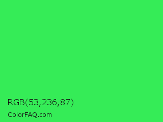 RGB 53,236,87 Color is a normal green color and the nearest color is UFO Green #3cd070. Hex code #35ec57 and RGB value is rgb(53,236,87). In RGB color space, this color is composed of 21% red, 93% green, 34% blue, In CMYK color space, this color is composed of 78% cyan, 0% magenta, 63% yellow , 7% black , In HSL color space, this color has a hue angle of 131° , 83% saturation and 57% lightness.