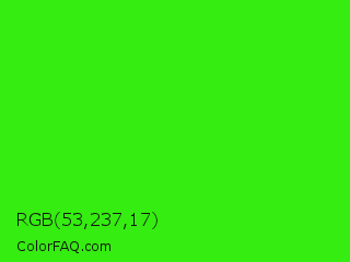 RGB 53,237,17 Color is a normal green color and the nearest color is Neon Green #39ff14. Hex code #35ed11 and RGB value is rgb(53,237,17). In RGB color space, this color is composed of 21% red, 93% green, 7% blue, In CMYK color space, this color is composed of 78% cyan, 0% magenta, 93% yellow , 7% black , In HSL color space, this color has a hue angle of 110° , 87% saturation and 50% lightness.