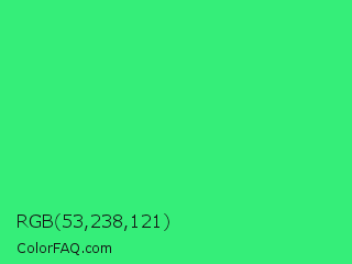 RGB 53,238,121 Color is a normal green color and the nearest color is UFO Green #3cd070. Hex code #35ee79 and RGB value is rgb(53,238,121). In RGB color space, this color is composed of 21% red, 93% green, 47% blue, In CMYK color space, this color is composed of 78% cyan, 0% magenta, 49% yellow , 7% black , In HSL color space, this color has a hue angle of 142° , 84% saturation and 57% lightness.