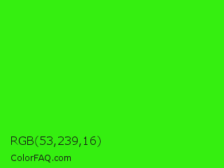 RGB 53,239,16 Color is a normal green color and the nearest color is Neon Green #39ff14. Hex code #35ef10 and RGB value is rgb(53,239,16). In RGB color space, this color is composed of 21% red, 94% green, 6% blue, In CMYK color space, this color is composed of 78% cyan, 0% magenta, 93% yellow , 6% black , In HSL color space, this color has a hue angle of 110° , 87% saturation and 50% lightness.