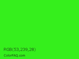 RGB 53,239,28 Color is a normal green color and the nearest color is Neon Green #39ff14. Hex code #35ef1c and RGB value is rgb(53,239,28). In RGB color space, this color is composed of 21% red, 94% green, 11% blue, In CMYK color space, this color is composed of 78% cyan, 0% magenta, 88% yellow , 6% black , In HSL color space, this color has a hue angle of 113° , 87% saturation and 52% lightness.