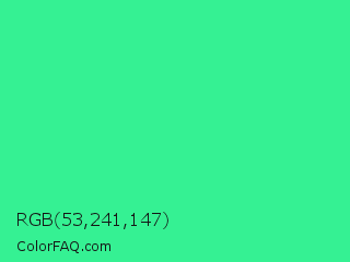 RGB 53,241,147 Color is a normal green color and the nearest color is Eucalyptus #44d7a8. Hex code #35f193 and RGB value is rgb(53,241,147). In RGB color space, this color is composed of 21% red, 95% green, 58% blue, In CMYK color space, this color is composed of 78% cyan, 0% magenta, 39% yellow , 5% black , In HSL color space, this color has a hue angle of 150° , 87% saturation and 58% lightness.