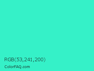 RGB 53,241,200 Color is a normal cyan color and the nearest color is Turquoise #40e0d0. Hex code #35f1c8 and RGB value is rgb(53,241,200). In RGB color space, this color is composed of 21% red, 95% green, 78% blue, In CMYK color space, this color is composed of 78% cyan, 0% magenta, 17% yellow , 5% black , In HSL color space, this color has a hue angle of 167° , 87% saturation and 58% lightness.