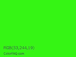 RGB 53,244,19 Color is a normal green color and the nearest color is Neon Green #39ff14. Hex code #35f413 and RGB value is rgb(53,244,19). In RGB color space, this color is composed of 21% red, 96% green, 7% blue, In CMYK color space, this color is composed of 78% cyan, 0% magenta, 92% yellow , 4% black , In HSL color space, this color has a hue angle of 111° , 91% saturation and 52% lightness.