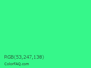 RGB 53,247,138 Color is a normal green color and the nearest color is Shamrock #33cc99. Hex code #35f78a and RGB value is rgb(53,247,138). In RGB color space, this color is composed of 21% red, 97% green, 54% blue, In CMYK color space, this color is composed of 79% cyan, 0% magenta, 44% yellow , 3% black , In HSL color space, this color has a hue angle of 146° , 92% saturation and 59% lightness.