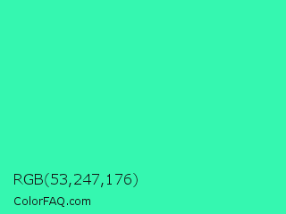 RGB 53,247,176 Color is a normal green color and the nearest color is Eucalyptus #44d7a8. Hex code #35f7b0 and RGB value is rgb(53,247,176). In RGB color space, this color is composed of 21% red, 97% green, 69% blue, In CMYK color space, this color is composed of 79% cyan, 0% magenta, 29% yellow , 3% black , In HSL color space, this color has a hue angle of 158° , 92% saturation and 59% lightness.