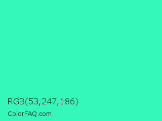 RGB 53,247,186 Color is a normal green color and the nearest color is Turquoise #40e0d0. Hex code #35f7ba and RGB value is rgb(53,247,186). In RGB color space, this color is composed of 21% red, 97% green, 73% blue, In CMYK color space, this color is composed of 79% cyan, 0% magenta, 25% yellow , 3% black , In HSL color space, this color has a hue angle of 161° , 92% saturation and 59% lightness.