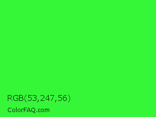 RGB 53,247,56 Color is a normal green color and the nearest color is Neon Green #39ff14. Hex code #35f738 and RGB value is rgb(53,247,56). In RGB color space, this color is composed of 21% red, 97% green, 22% blue, In CMYK color space, this color is composed of 79% cyan, 0% magenta, 77% yellow , 3% black , In HSL color space, this color has a hue angle of 121° , 92% saturation and 59% lightness.
