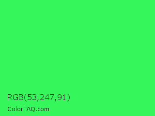 RGB 53,247,91 Color is a normal green color and the nearest color is UFO Green #3cd070. Hex code #35f75b and RGB value is rgb(53,247,91). In RGB color space, this color is composed of 21% red, 97% green, 36% blue, In CMYK color space, this color is composed of 79% cyan, 0% magenta, 63% yellow , 3% black , In HSL color space, this color has a hue angle of 132° , 92% saturation and 59% lightness.