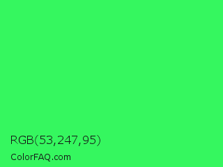 RGB 53,247,95 Color is a normal green color and the nearest color is UFO Green #3cd070. Hex code #35f75f and RGB value is rgb(53,247,95). In RGB color space, this color is composed of 21% red, 97% green, 37% blue, In CMYK color space, this color is composed of 79% cyan, 0% magenta, 62% yellow , 3% black , In HSL color space, this color has a hue angle of 133° , 92% saturation and 59% lightness.