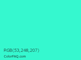 RGB 53,248,207 Color is a normal cyan color and the nearest color is Turquoise #40e0d0. Hex code #35f8cf and RGB value is rgb(53,248,207). In RGB color space, this color is composed of 21% red, 97% green, 81% blue, In CMYK color space, this color is composed of 79% cyan, 0% magenta, 17% yellow , 3% black , In HSL color space, this color has a hue angle of 167° , 93% saturation and 59% lightness.