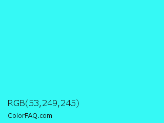 RGB 53,249,245 Color is a normal cyan color and the nearest color is Loeen #15f2fd. Hex code #35f9f5 and RGB value is rgb(53,249,245). In RGB color space, this color is composed of 21% red, 98% green, 96% blue, In CMYK color space, this color is composed of 79% cyan, 0% magenta, 2% yellow , 2% black , In HSL color space, this color has a hue angle of 179° , 94% saturation and 59% lightness.